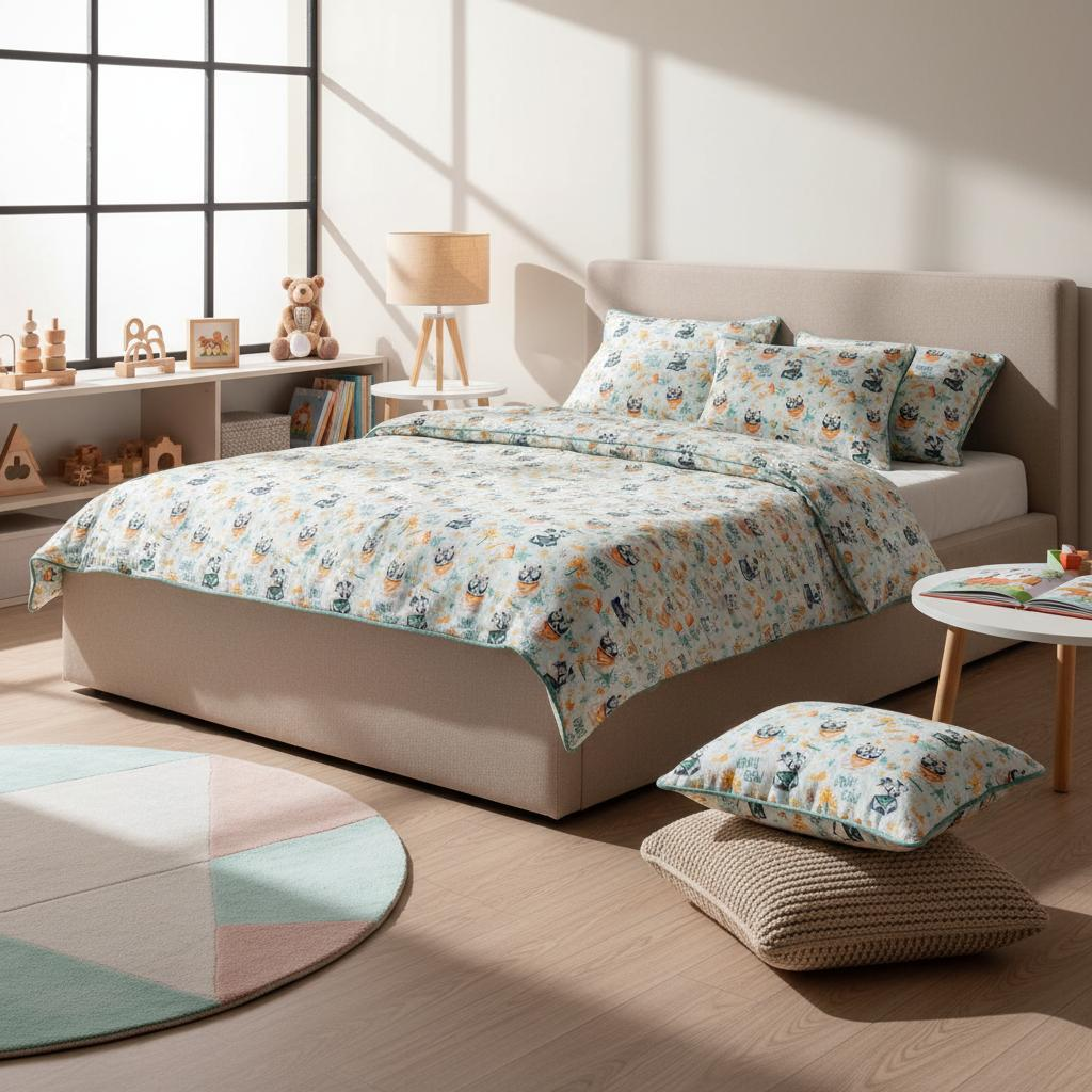 Mit dem Set „CHARLIE 1 & 2“ bringst Du die Farben der Natur ins Kinderzimmer – ein beruhigendes Grün trifft auf fröhliche, kindgerechte Muster in sanftem Multicolor. Ein liebevolles Statement für Wärme, Sicherheit und Sorglosigkeit im Alltag Deiner Kinder.