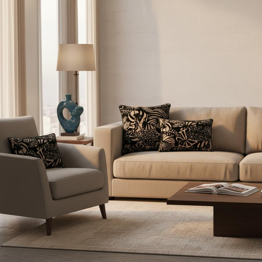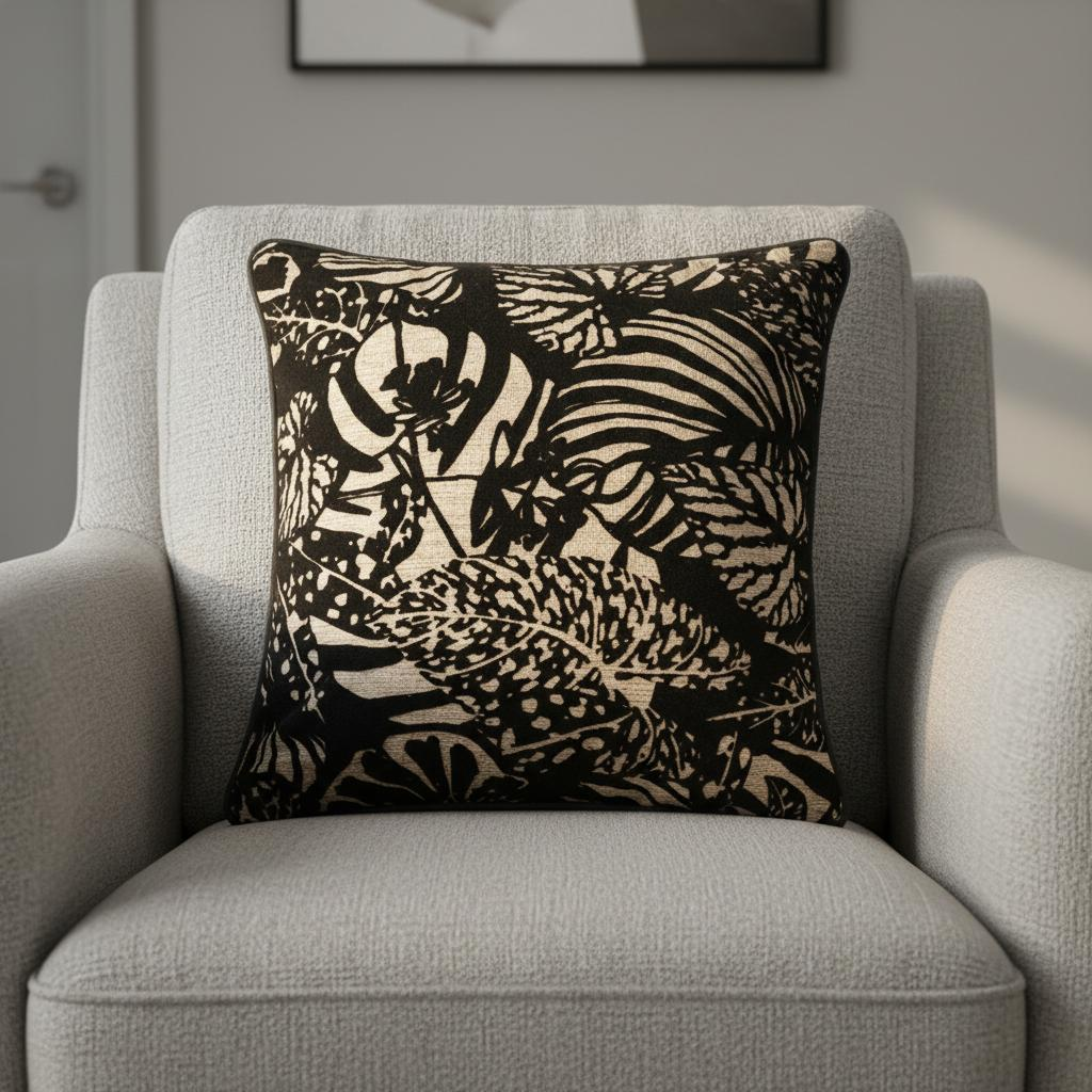 Con la combinazione di nero profondo, argento scintillante e un tocco d'oro, questo set di cuscini appare come un accessorio su misura per interni esigenti – elegante, potente e consapevole dello stile.