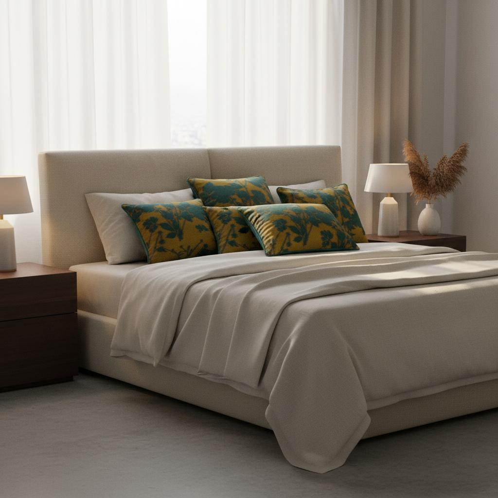 Zestaw poduszek EVORA 1 & 2 łączy nasycone odcienie zieleni z ciepłym złoto-brązowym – połączenie kolorów, które zapewnia zarówno uziemienie, jak i ekskluzywność. Ten design wnosi kawałek natury do Twojej przestrzeni mieszkalnej, nie rezygnując z wyrafinowania.