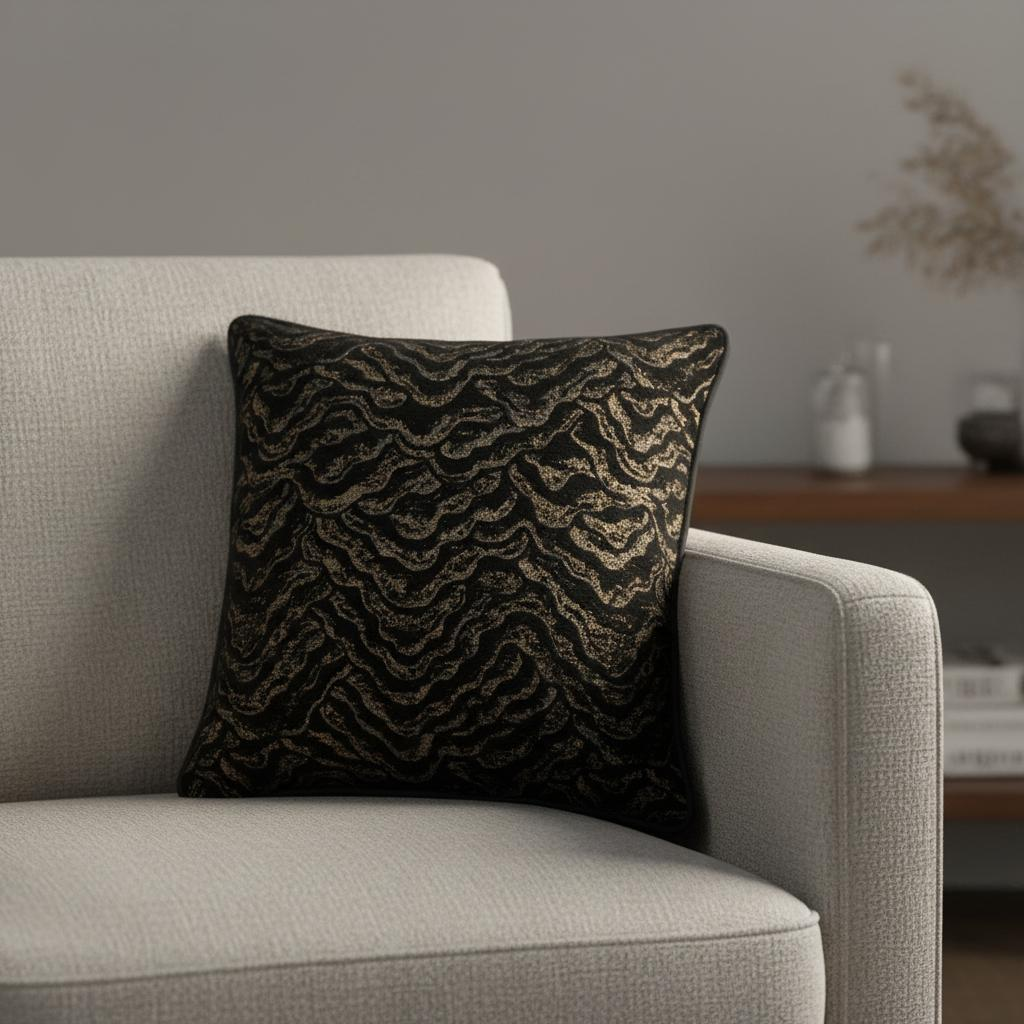 Die tiefen Schwarznuancen, meliert wie edler Stein, erinnern an die modernen Silhouetten sizilianischer Architektur und die geheimnisvolle Tiefe einer mediterranen Nacht. Ein Kissen wie ein Statement – zurückhaltend, aber präsent.